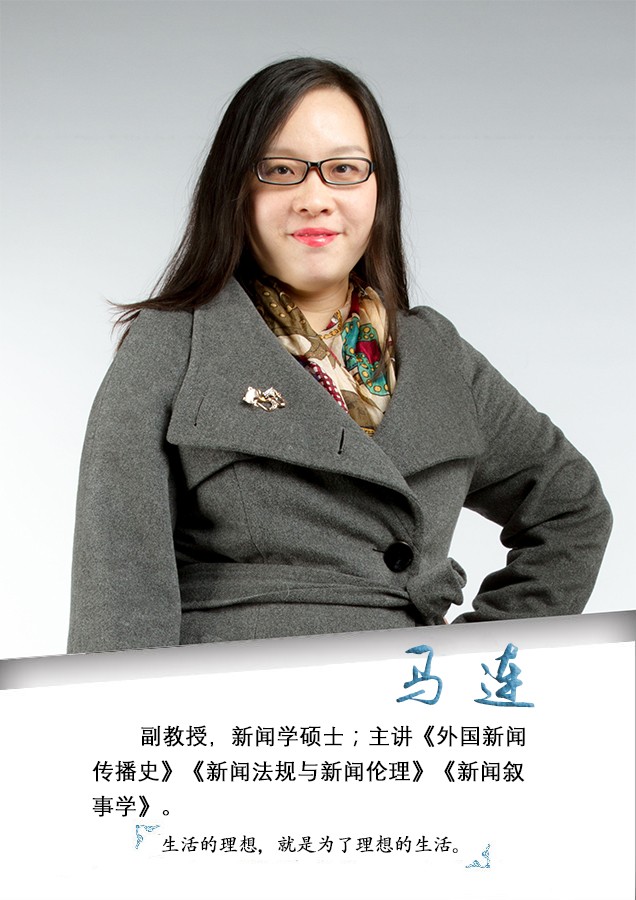 马连,女,1983年生,河北易县人。2005年毕业于河北大学广播电视新闻学专业,获文学学士学位;2008年毕业于河北大学,获文学硕士学位。现任新闻学专业主任、河北师范大学新闻传播学院副教授、新闻与传播专业硕士生导师。主要研究方向:电视新闻、新闻伦理。主讲课程:《外国新闻传播史》、《新闻法规与新闻伦理》、《新闻叙事学》。主持河北省哲学社会科学规划办公室、河北省高等学校人文社会科学研究项目等课题6项,获评2021年河北师范大学师德师风考核优秀、2019年获河北师范大学优秀指导教师。
