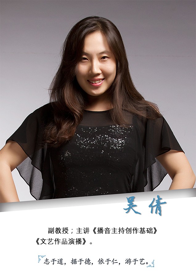 吴倩,女,1978年生,河北石家庄人。2003年毕业于福建师范大学音乐学院,获文学硕士学位。现任播音与主持艺术专业主任,河北师范大学新闻传播学院播音与主持艺术系主任、播音系教工党支部书记,副教授、艺术学硕士生导师。兼任河北省语言文字工作专家、河北省普通话测试员培训班指导组成员、河北广播电视台专家评议组成员、河北省冬奥志愿服务宣讲团总指导、国家级普通话测试员。主要研究方向:语言艺术表演与教育、口语传播、艺术传播。主讲课程:播音主持创作基础、文艺作品演播、影视音乐。